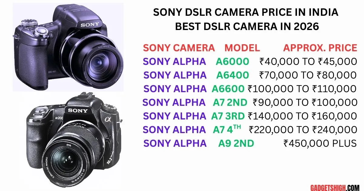 Neeche di gayi Sony DSLR Camera Price List India me popular Sony cameras ki approx pricing batati hai jise Gadgets high buyers reference ke liye use kar sakte hain: